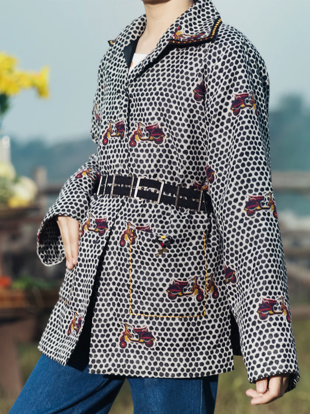 Yarn-dyed scooter themed jacket with double collar and pockets