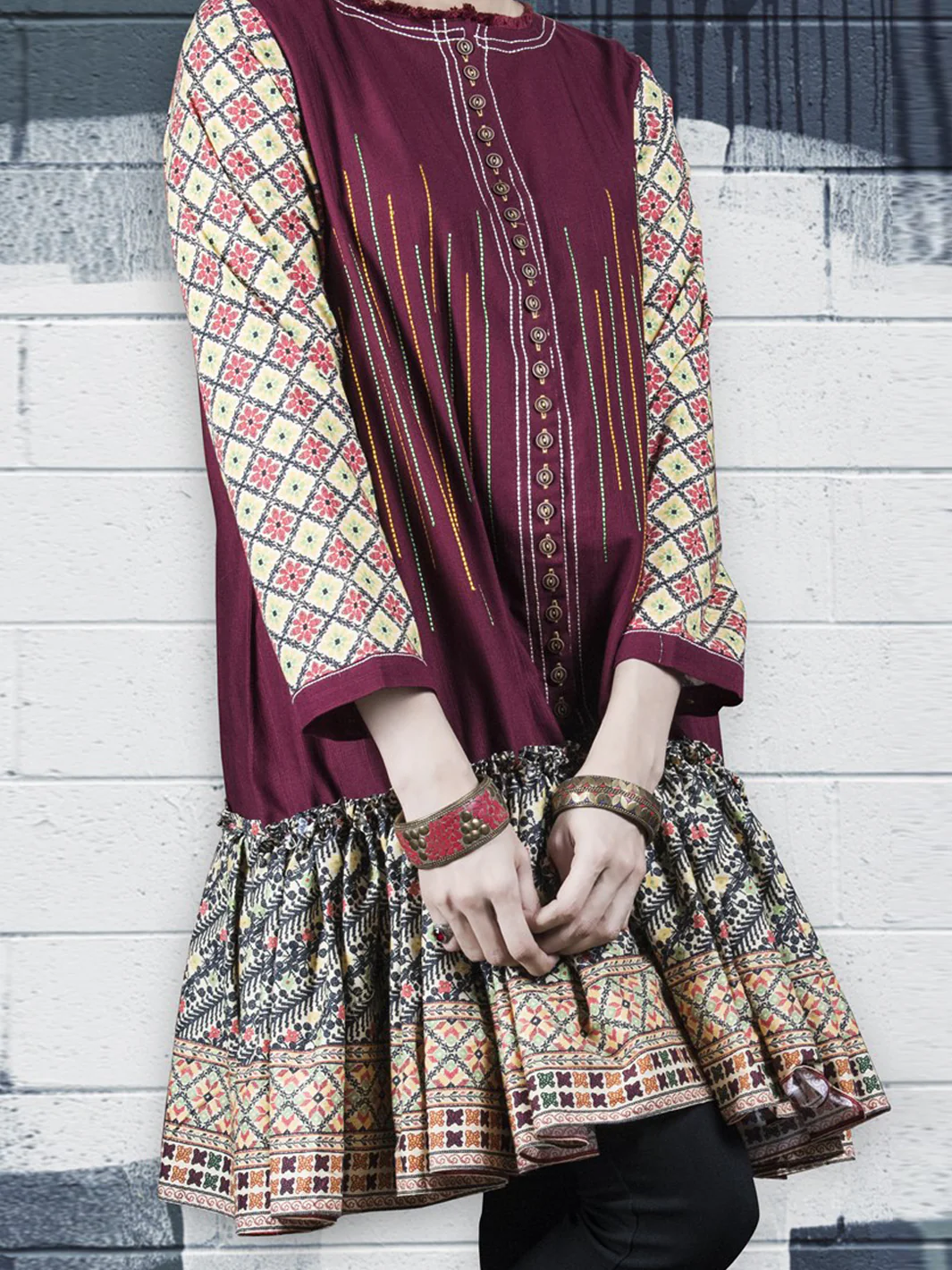 Flared Button Down Tunic With Collar And Printed Sleeves, Having Stitch Details On Front.